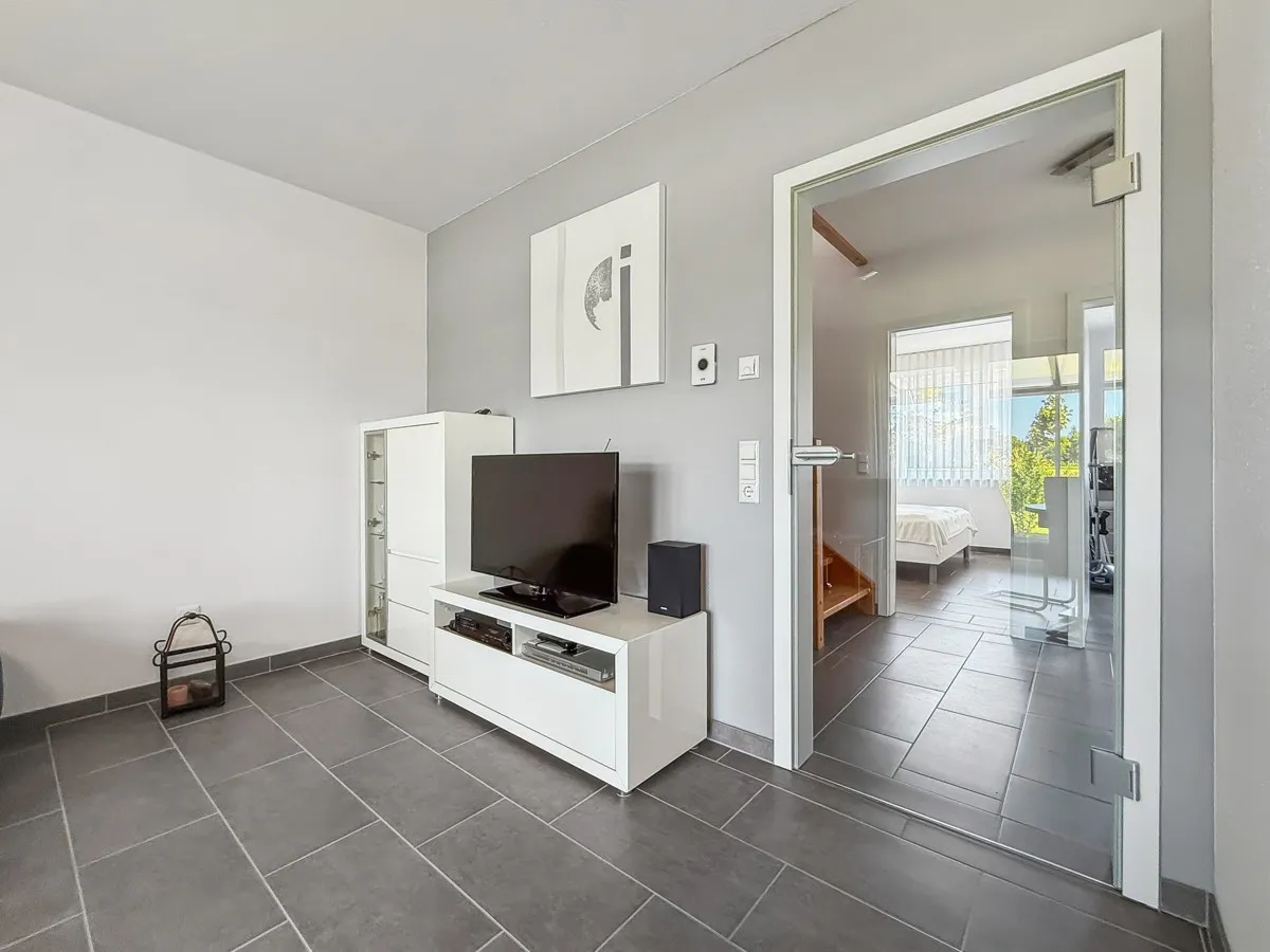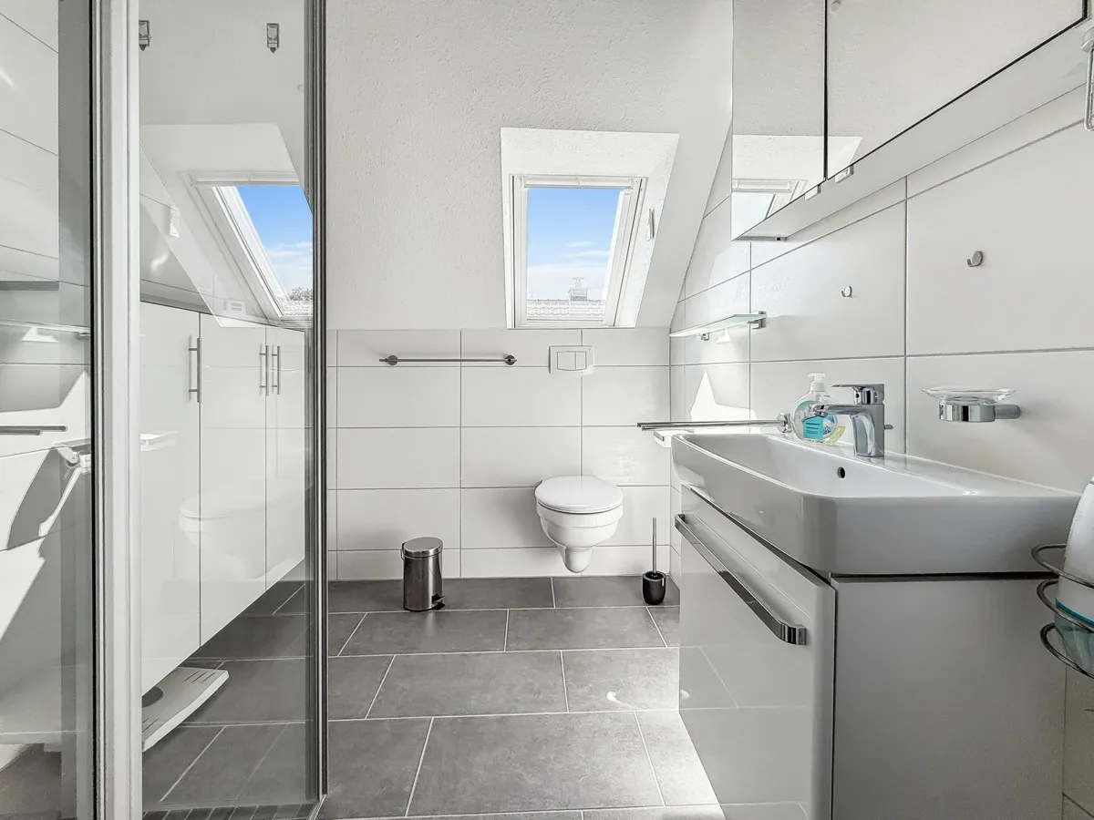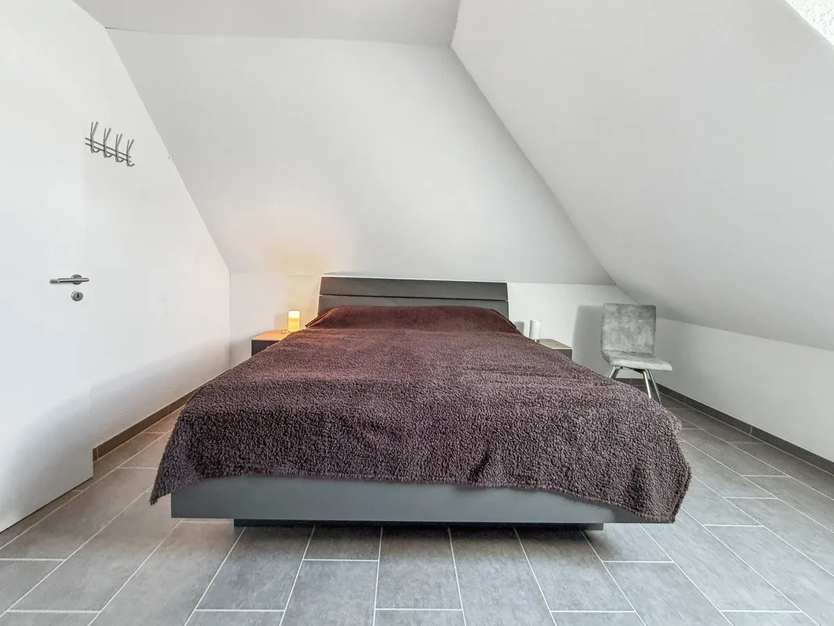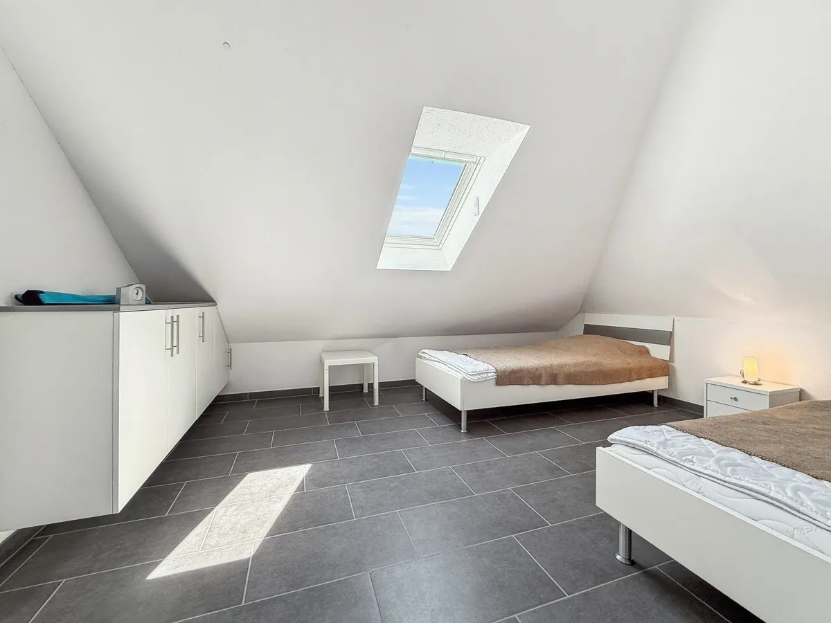 Über eine wunderschöne Holztreppe gelangen Sie in das Obergeschoss. Hier finden Sie folgende Raumaufteilung: Flur, großes Schlafzimmer mit modernen Einbauschränken, Gast/Kind Zimmer, HWR/Heizraum, schönes Badezimmer mit ebenerdiger Dusche und WC. Die Immobilie hat insgesamt 100 m² Wohn-/und Nutzfläche.