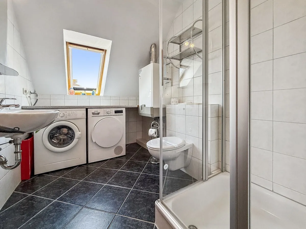 Über eine elegante, freitragende Treppe gelangen Sie vom Wohnbereich ins Obergeschoss. Hier erwartet Sie ein Schlafzimmer sowie ein helles Kinder-/Gästezimmer mit außergewöhnlichen Glaserker. Das Badezimmer mit Tageslicht verfügt über eine verglaste Dusche sowie eine Waschmaschine und einen Trockner. Zusätzlichen Raum bietet der aufwendig ausgebaute Spitzboden.