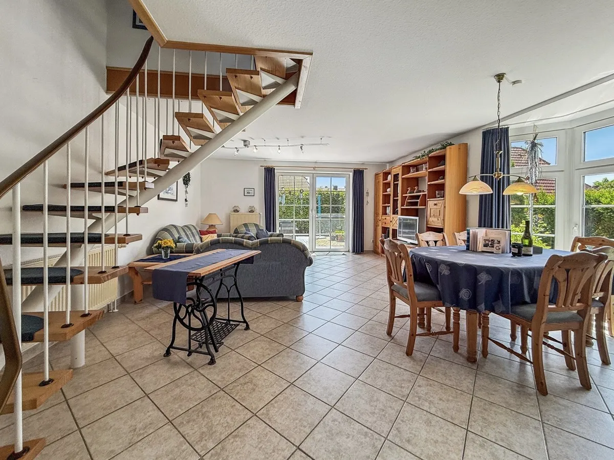 Im Erdgeschoss empfängt Sie ein heller Eingangsbereich mit Windfang, von dem aus ein Abstellraum mit Garderobe sowie ein Gäste-WC zugänglich sind. Der großzügige Wohnbereich mit gemütlicher Sofaecke und offenem Essbereich bildet das Herzstück des Hauses. Von hier aus gelangen Sie direkt auf die sonnige, uneinsehbare Terrasse mit elektrischer Markise; Außengrill - ideal für entspannte Stunden im Freien. Eine separate Küche mit Einbauküche, inklusive kürzlich erneuertem Siemens-Herd, komplettiert das Raumangebot auf dieser Ebene. Ein PKW-Stellplatz, ein Außenabstellraum sowie ein schönes Gartenhaus runden das Außenangebot ab.