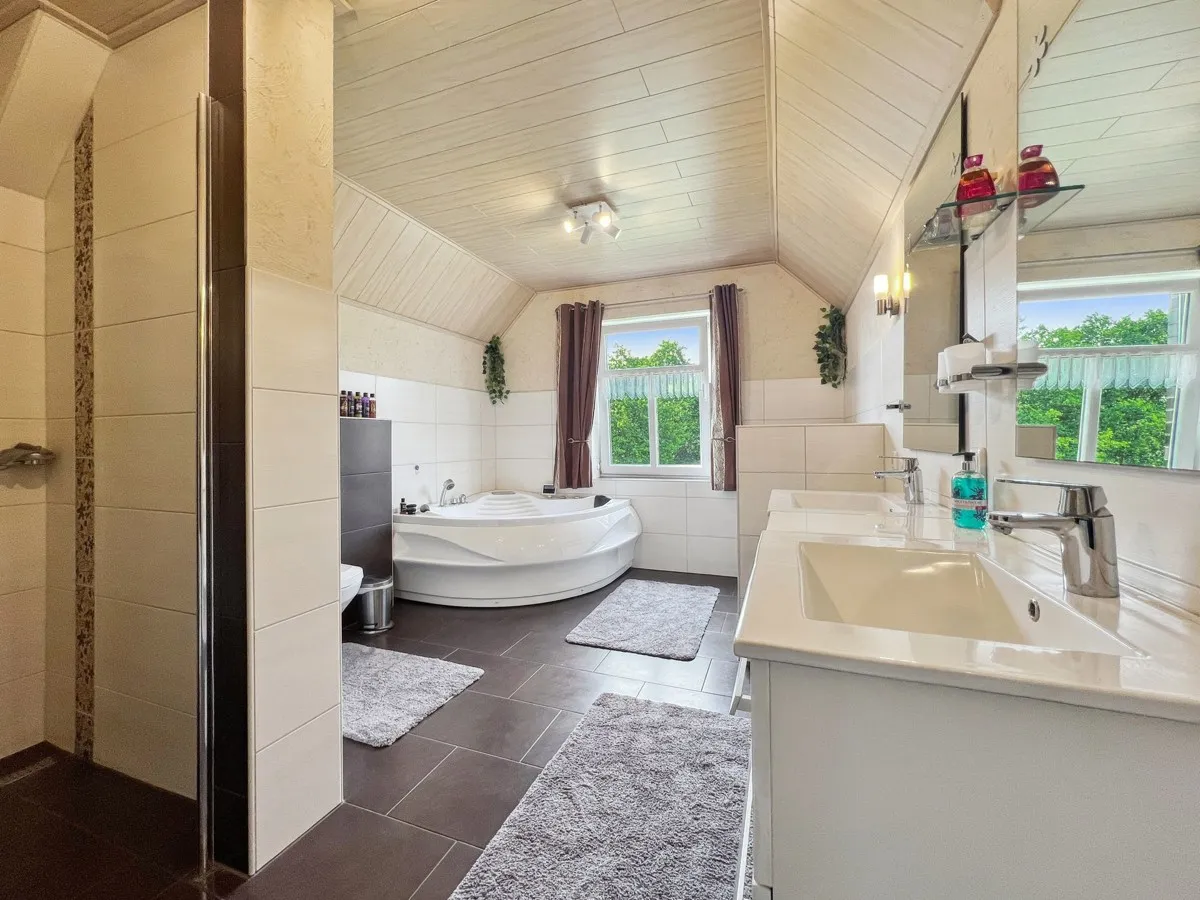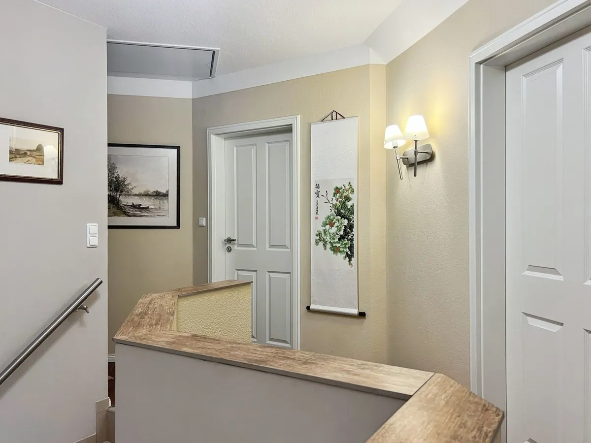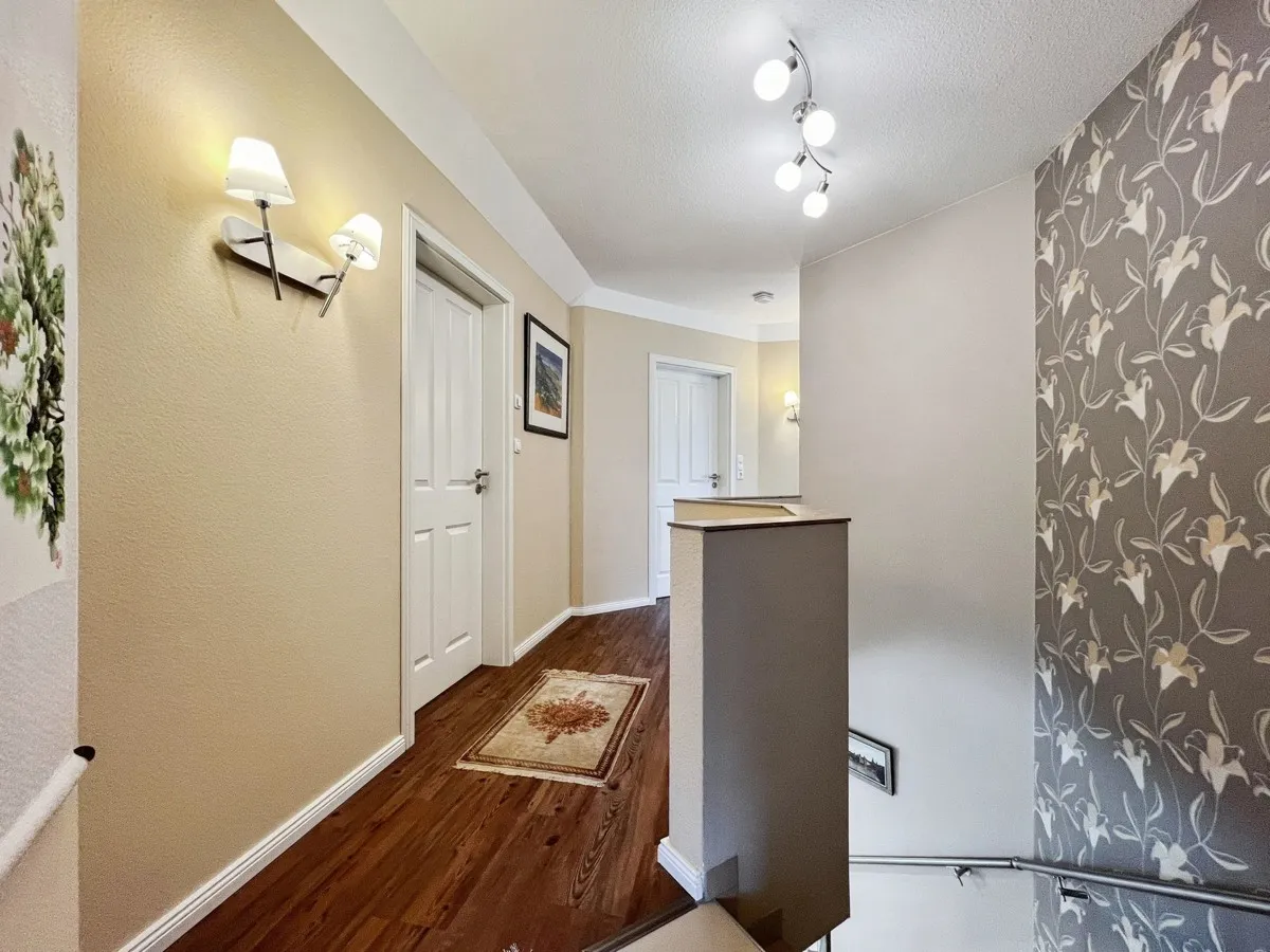 Eine massive Steintreppe führt Sie vom Erdgeschoss in das Obergeschoss, wo Sie 5 x Zimmer erwarten. Aktuell ein Schlafzimmer, ein Büro und 3 x Kinderzimmer. Das Badezimmer im Dachgeschoss beeindruckt mit einem Whirlpool und einer großzügigen Dusche usw. Der Spitzboden ist begehbar und bietet zusätzlichen Stauraum. Das exklusive Mobiliar ist nicht im Kaufpreis enthalten. Das Anwesen befindet sich in einem äußerst gepflegten Zustand.