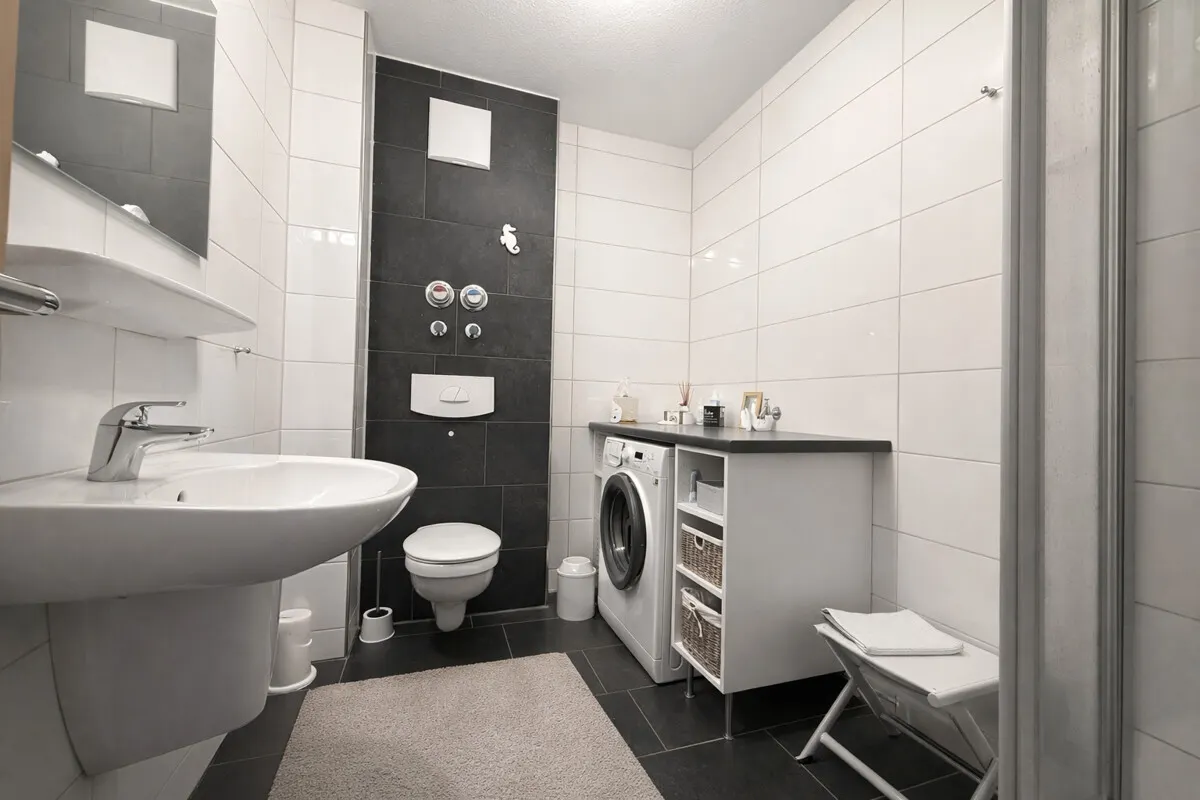 Das moderne Badezimmer bietet mit seiner ebenerdigen Dusche, dem beheizbaren Handtuchhalter und der integrierten Waschmaschine zusätzlichen Komfort. Ein ruhiges, großzügiges Schlafzimmer sowie ein praktischer Abstellraum runden das Raumangebot perfekt ab.