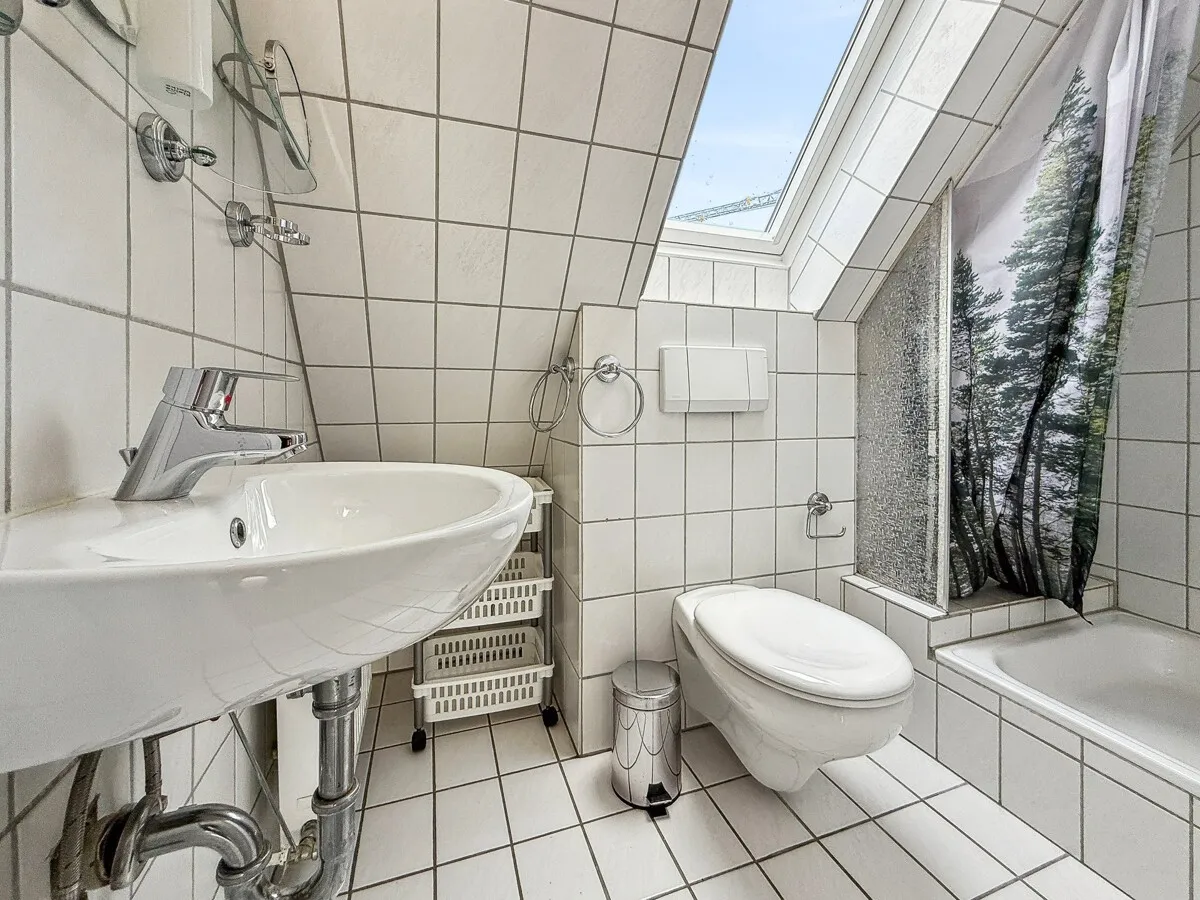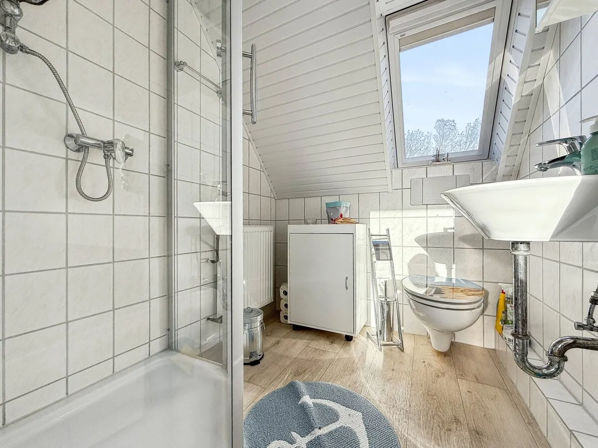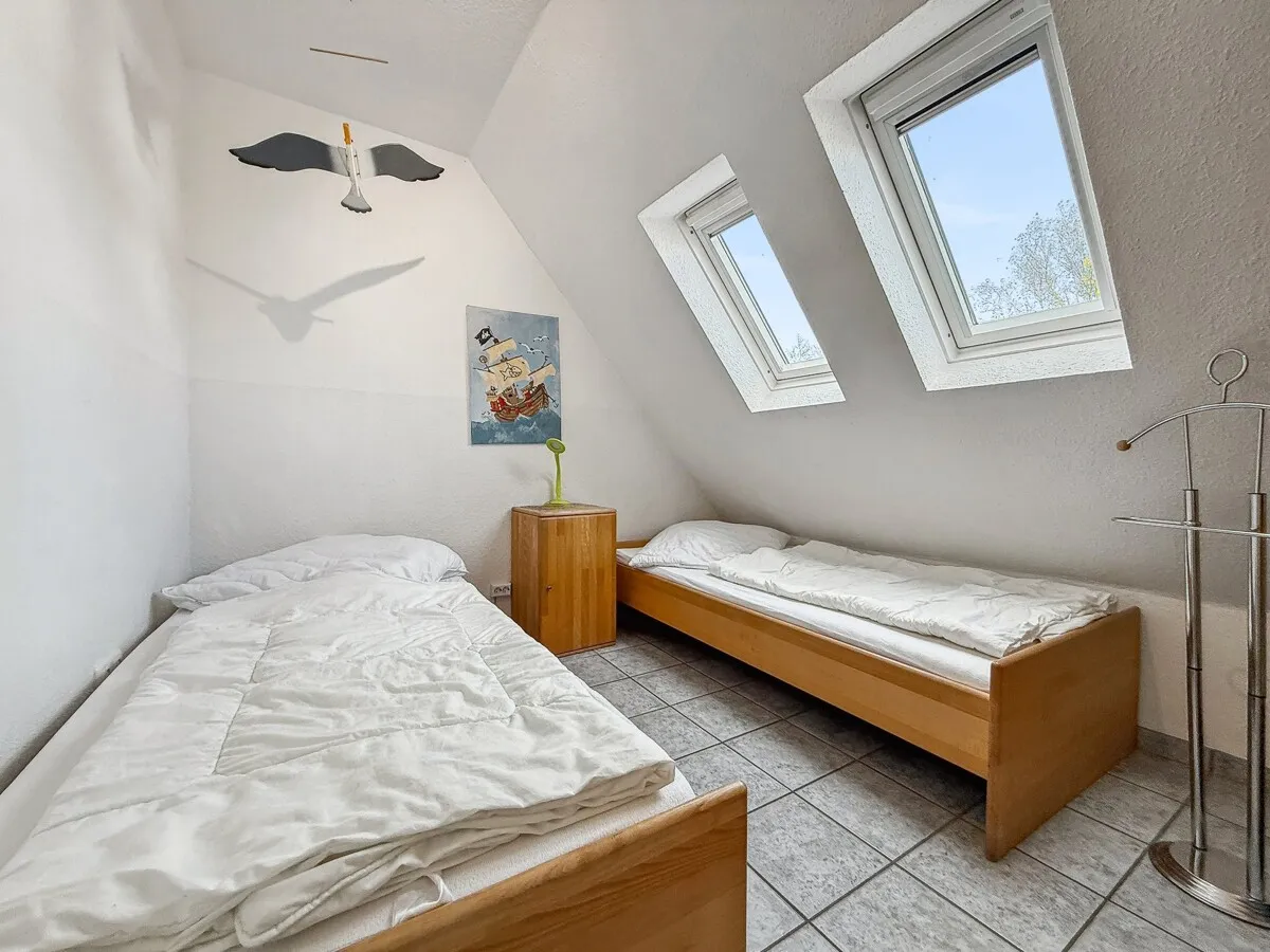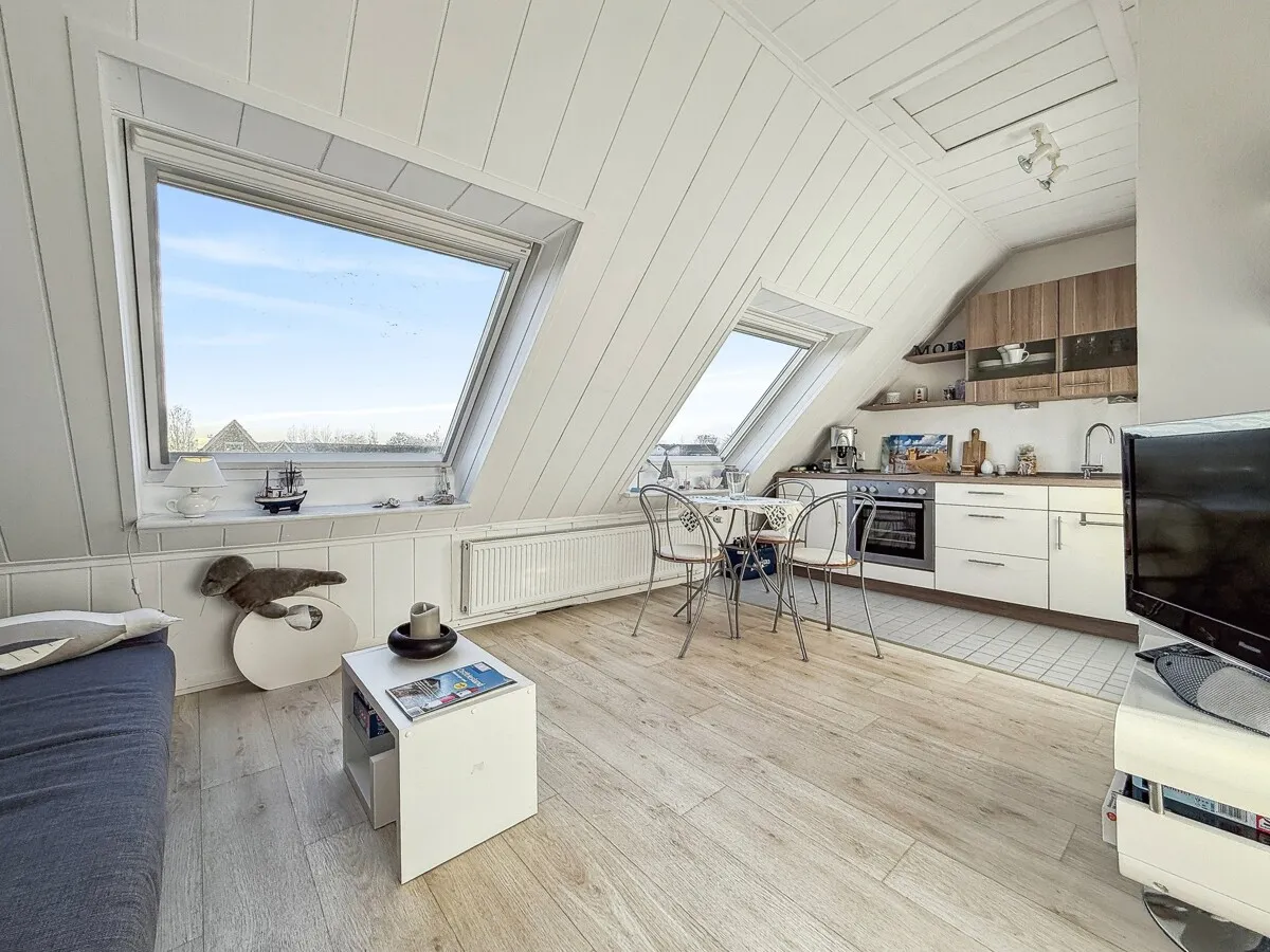 Der ausgebaute Spitzboden wird derzeit von den Eigentümern privat genutzt. Hier entstand ein stilvoller Rückzugsort mit einem hellen Wohn- und Kochbereich, großen Velux-Fenstern mit weitem Blick über Norddeich, einem kleinen Schlafzimmer und einem modernen Badezimmer.
