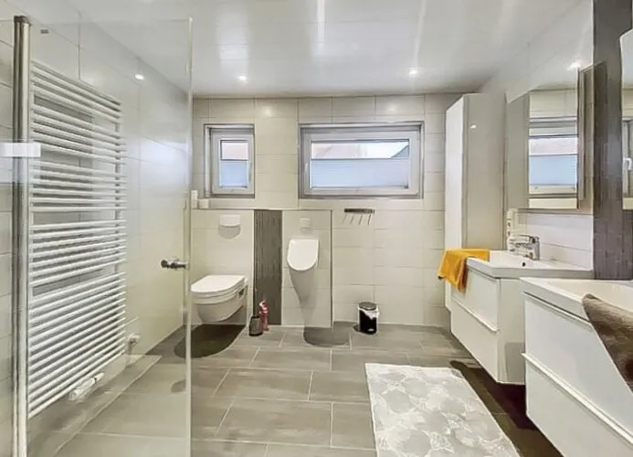 Das Tageslicht-Badezimmer ist repräsentativ gestaltet und verfügt über eine große, begehbare Dusche, einen Doppelwaschtisch sowie einen modernen LED-Spiegel. Eine schöne Terrasse sowie ein privater CARPORT direkt am Haus runden das exklusive Angebot ab.