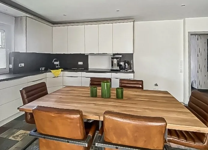 Die Wohnung bietet ein stilvolles und modernes Wohnkonzept, das keine Wünsche offenlässt. Herzstück ist der großzügige Wohn- und Essbereich mit direktem Zugang zur Terrasse. Die hochwertige Einbauküche der Marke Nolte ist vollständig integriert und lädt zum Kochen in maritimer Wohlfühlatmosphäre ein.