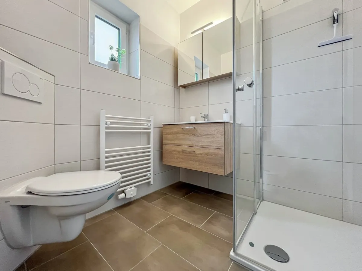 Aufteilung : Diele, gemütliches Wohnzimmer mit bodentiefen Terrassentüren, Essbereich und Zugang zur Küche, ein Badezimmer mit ebenerdiger Dusche und WC; alles elegant und komfortabel angelegt. Das Dachgeschoss bietet ein Schlafzimmer und ein Kinderzimmer sowie ein Gäste-WC.