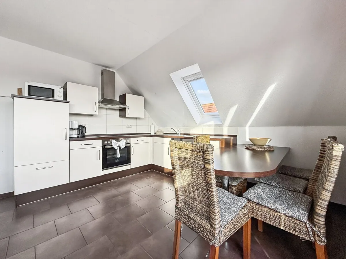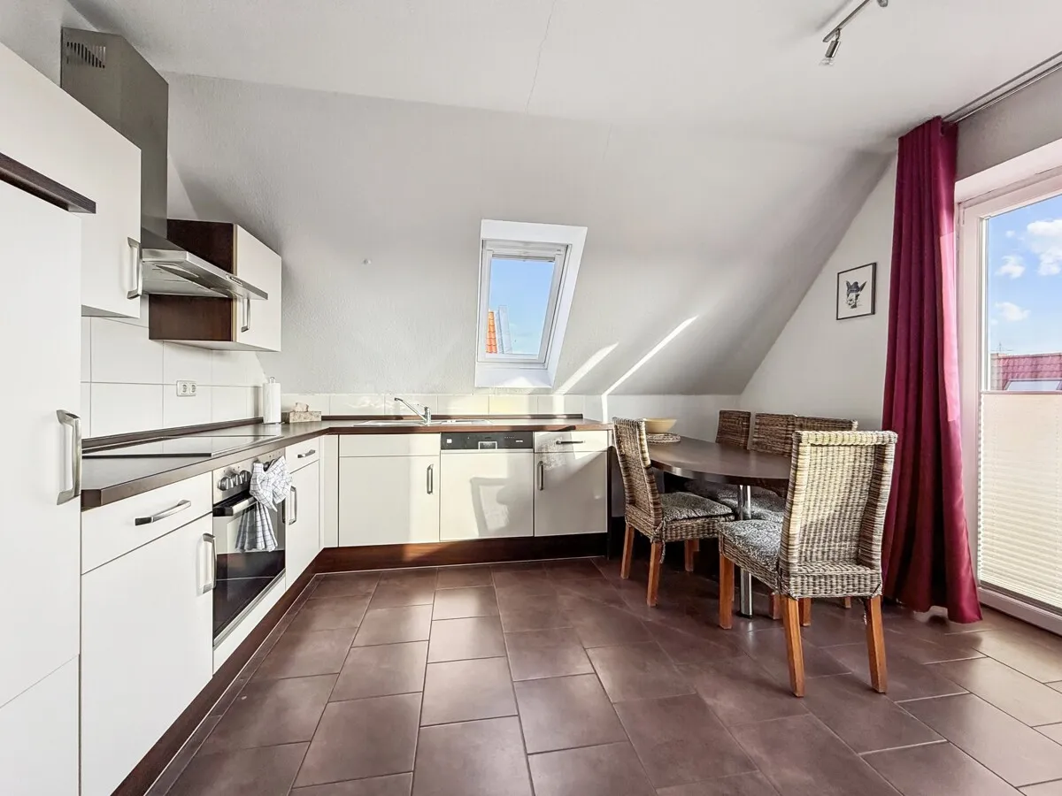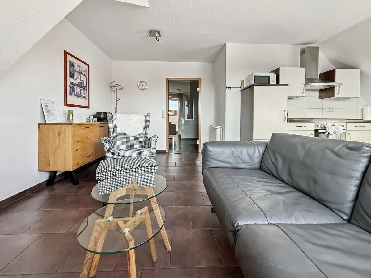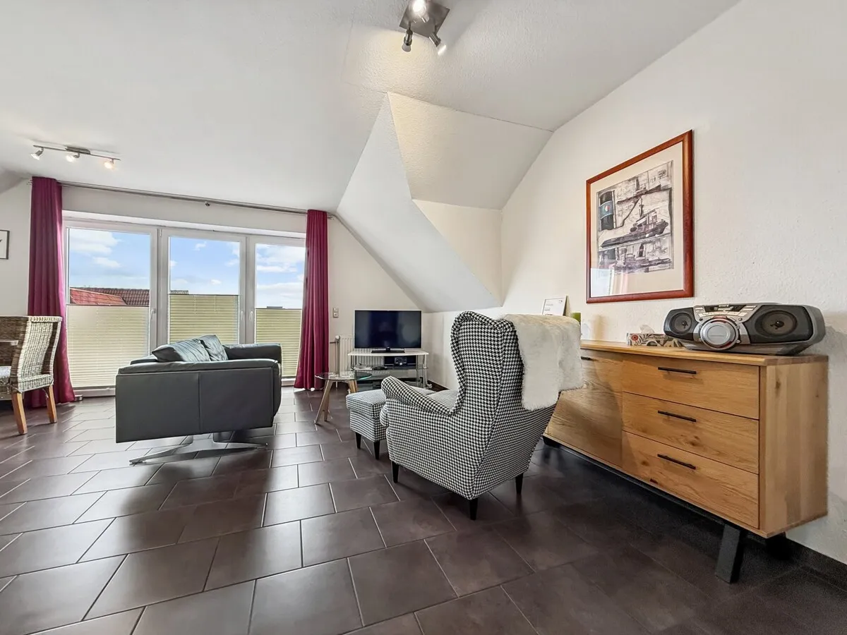 Bereits beim Betreten der Wohnung spürt man den besonderen Charakter eines Penthouses: die ruhige, zurückgezogene Lage im Dachgeschoss, der weite Ausblick über Norddeich und die großzügige Raumwirkung des offenen Wohn- und Essbereichs schaffen eine einmalige Atmosphäre.