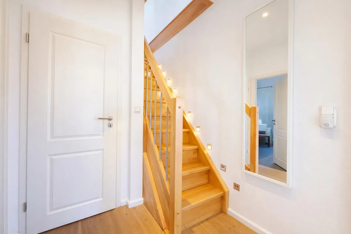Im Innenbereich wurden stilvolle weiße Türen sowie hochwertige Bodenbeläge verbaut, die das elegante Gesamtbild unterstreichen. Ein besonderes Merkmal ist der eigene, private Hauseingang mit einer LED Treppenbeleuchtung der ein hohes Maß an Privatsphäre garantiert und fast den Charakter eines eigenständigen Hauses vermittelt.
