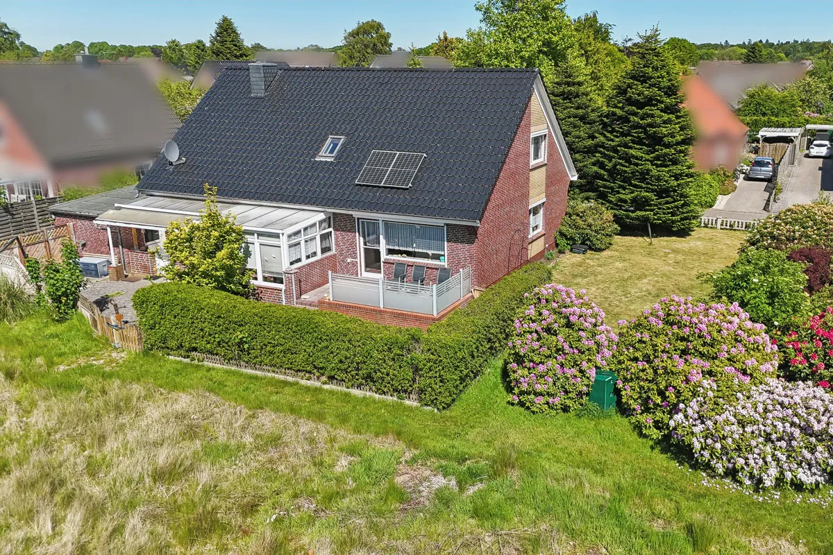 Der Außenbereich wurde mit viel Liebe zum Detail angelegt. Besonders in der Rhododendronblüte zeigt sich der Garten von seiner schönsten Seite und wird zum farbenfrohen Blickfang. Ein Rasen-Roboter übernimmt zuverlässig die Pflege der Grünflächen. Für Fahrzeuge stehen Ihnen eine Garage, ein geräumiger Abstell- und Geräteraum sowie drei zusätzliche PKW-Stellplätze zur Verfügung.